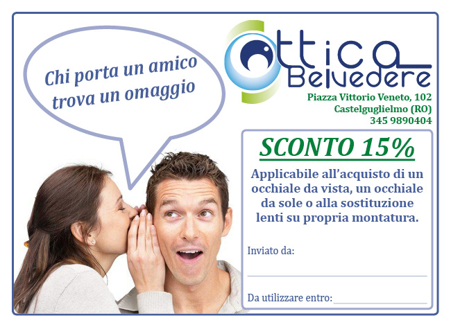Dopo aver acquistato il tuo occhiale da vista, ti verrà consegnato un coupon come quello che vedi in foto. Questo buono del 15% potrà essere utilizzato da un tuo amico (parente, conoscente), per l’acquisto di un occhiale da vista, da sole o sostituzione lenti sulla propria montatura; quando il suo buono verrà utilizzato, tu potrai ritirare, presso il nostro punto vendita, il tuo omaggio a scelta tra quelli che vedi in foto!
